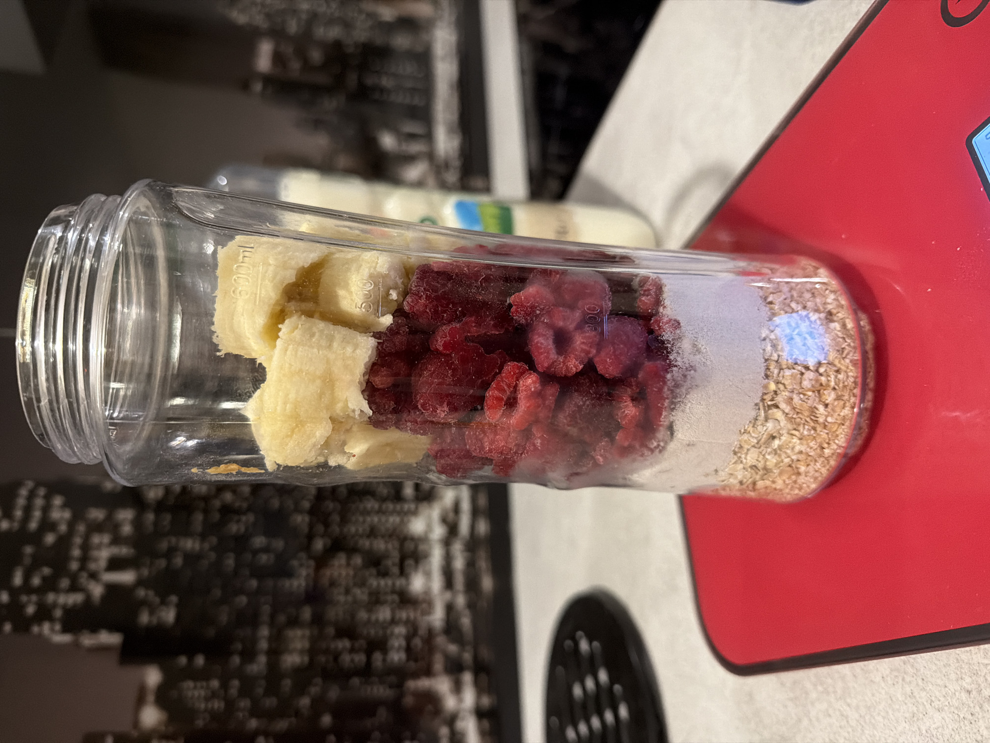 A clear plastic blender jar is lying horizontally on a red surface. The jar contains several layers of ingredients, from left to right: sliced bananas, frozen raspberries, white powder (possibly protein powder or sweetener), and oats. A bottle is faintly visible in the background. The image does not provide any location information, so I can't infer that it is in Plovdiv, Bulgaria.