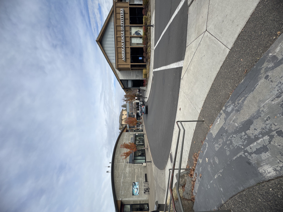 A tilted outdoor shot showcases a street view with buildings on either side. "American Eagle Outfitters" signage is visible on one building. A road with a white stripe runs between the buildings, and a black car is seen driving on it. Steps and railings occupy the lower right corner, appearing worn. The sky is cloudy and blue.