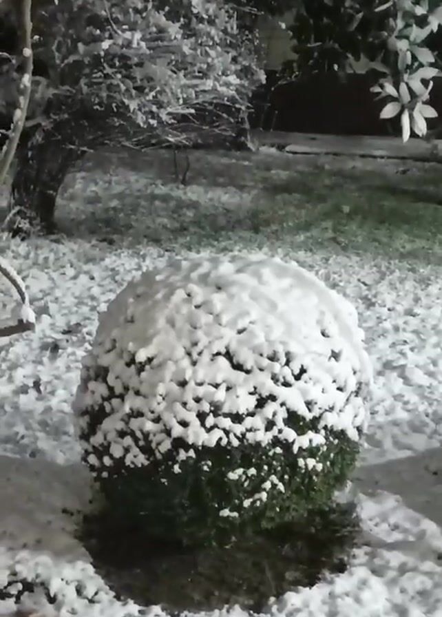 garden covered in snow at night. The first shot focuses on a round bush completely blanketed in snow. The camera then pans upwards to reveal a trellis-like structure covered in snow, with snow-covered trees in the background. The sky is dark.