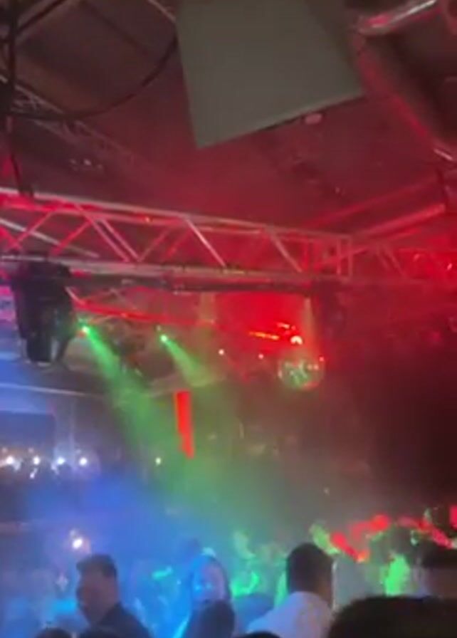 densely packed dance floor in a nightclub. Red and blue stage lights illuminate the crowd. Above, a metal framework supports lighting equipment, and a disco ball hangs from the ceiling. People are standing close together, talking and facing different directions. The overall atmosphere is dark and energetic.
