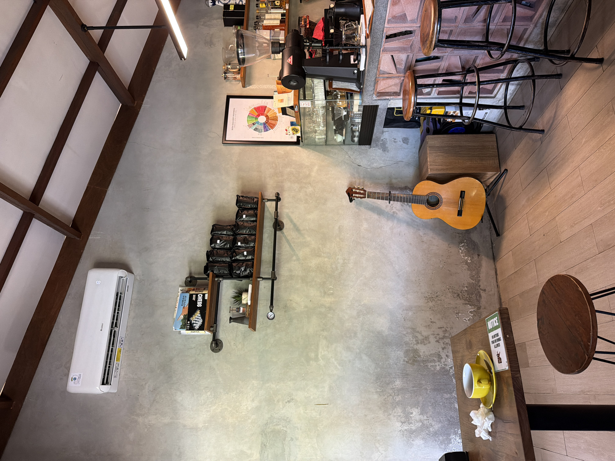 The image captures an interior view of a building in Kerobokan Kelod, Indonesia. The architectural features include a white air conditioning unit, a wooden truss ceiling, and concrete flooring with a light-to-medium grey hue. The space contains a shelf unit with black bags. A guitar sits on the floor in a vertical position. A coffee table with a yellow cup and saucer with tissue on it is visible, with a stool nearby. A shelf unit displays products related to coffee. The lighting in the scene is provided by overhead lighting.