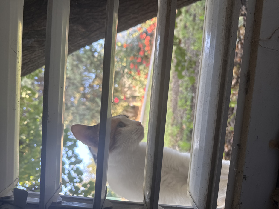 - "Through white barred window panes, a cat with a white coat and patches of orange and black peers out" by FM-Y9nKo2, licensed under CC BY 4.0