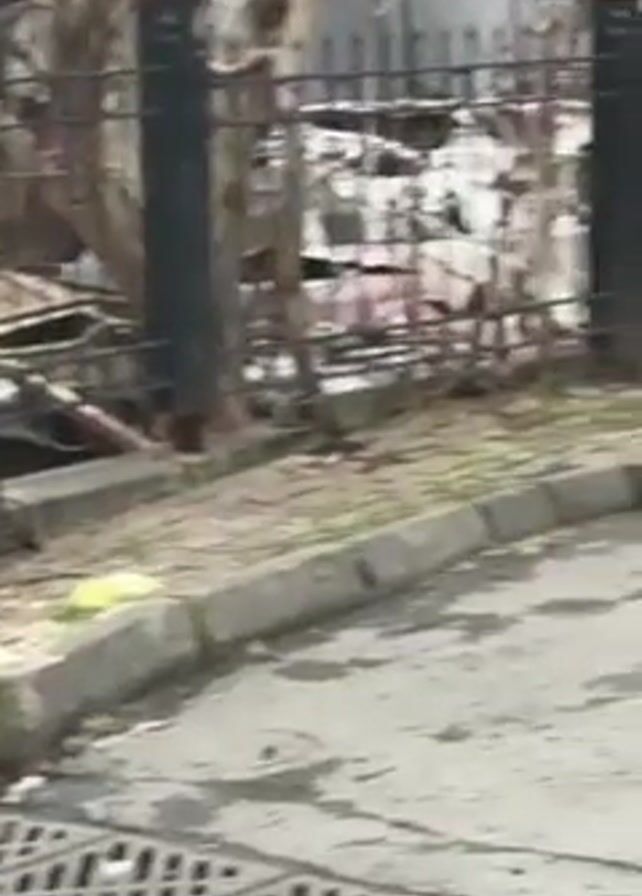 street scene. A drain is visible in the foreground. In the background, there is a black metal fence behind which lies what appears to be some sort of debris or destruction. A few leafless trees stand between the fence and the debris. Several cats walk along the sidewalk in front of the fence. The lighting suggests it is daytime.