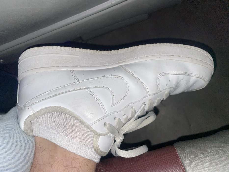 - "A person is wearing a white Nike Air Force 1 sneaker with white laces and a gray sock" by FM-qaxKg1, licensed under CC BY 4.0