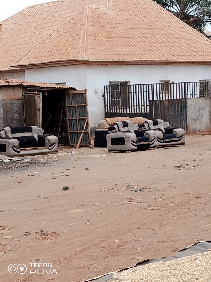A collection of sofas sits outdoors near a building. Some sofas are beige and black, while others appear to be light beige. An adjacent open shed or workshop reveals lumber inside. A fence stands in front of a white building with a brown roof. A dirt ground stretches across the foreground. A logo in the lower-left corner reads "TECNO POVA." In the lower right corner, there appear to be grains spread out in a mat.
