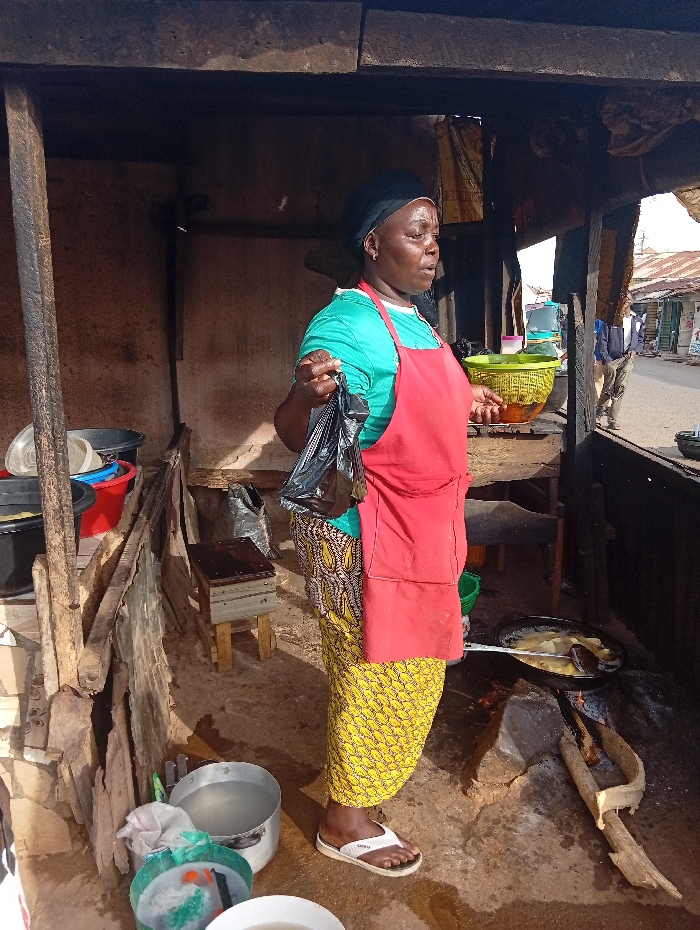 - "An adult female is depicted standing within a rustic, open-fronted food stall in what appears to be a market or roadside setting in Jos, Nigeria" by FM-Ha99I2, licensed under CC BY 4.0