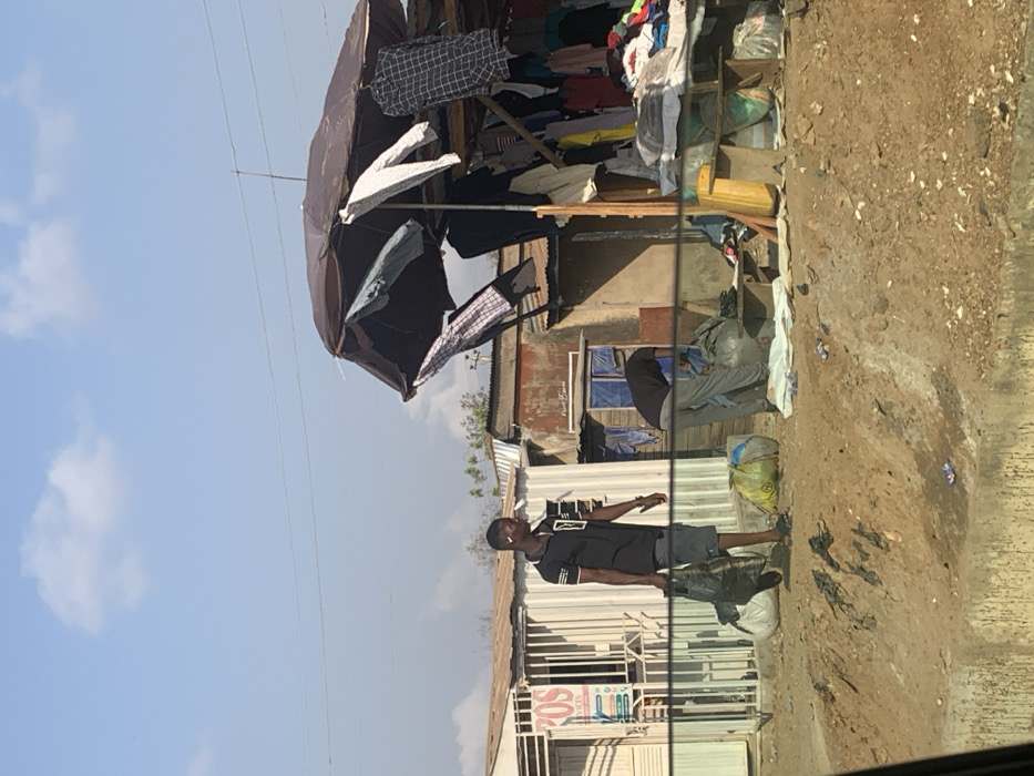 The image depicts an informal street market scene in Abobo, Nigeria, under a clear, bright blue sky with sparse clouds. The foreground consists of uneven, dry, light brown earth with scattered small debris, bordered by a concrete or stone curb in the lower frame. Overhead, thin utility wires span the scene. On the left, a male with dark skin, wearing a black polo shirt, dark shorts, and dark slide sandals, walks towards the right. He carries one black plastic bag in each hand and has a white earpiece in his right ear. A light-colored, possibly white or light green, sack rests on the ground near his left foot. In the mid-ground to the right, a second male figure, also with dark skin, is bent over, facing away from the viewer. He wears a dark long-sleeved shirt and light gray sweatpants, and appears to be rummaging through a large, light-colored bag or a pile of items on the ground next to a small wooden table. Behind him, an informal market stall is constructed with a dark brown or black umbrella serving as a primary canopy, supported by wooden poles. Various shirts, including checkered patterns, are hung from the umbrella's frame and the supporting structure. Piles of additional clothing items are displayed on surfaces beneath the canopy. A yellow/green sack is visible on the ground near the market stall. The background features several buildings of varying construction. To the left, a structure with a white corrugated metal facade displays a red sign reading "POS SERVICES" and has barred windows. Adjacent to it, a more weathered building with a corrugated metal roof, exposed brick or plaster, and a blue-framed window is visible. Clothes are draped on a line or rail in front of this building. Further structures with corrugated metal roofs are visible in the distant background.