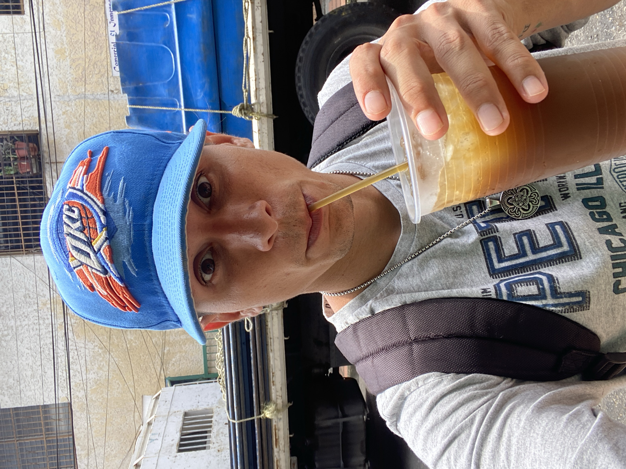 The image displays a close-up, waist-up portrait of a single individual, presumed male, positioned outdoors in San José de Barlovento, Venezuela. The individual has a light-medium skin tone, dark eyes, and is looking directly at the camera with a wide-eyed expression and slightly puckered lips around a straw. He is wearing a blue baseball cap with an embroidered orange, blue, and white "OKC" logo (Oklahoma City Thunder), a grey short-sleeved t-shirt with partial blue graphic text (including "PE" and "CHICAGO ILL"), a silver-colored chain necklace with a circular Celtic knot pendant, and a black backpack with a visible shoulder strap. He is holding a clear plastic cup containing an iced beverage with a dark brown liquid base and a lighter orange-brown liquid layer on top, consuming it through a tan-colored straw held in his left hand. The background consists of an urban street environment under daylight. Immediately behind the person, a dark truck bed is visible, partially covered by a large blue tarp or container secured with ropes. In the mid-ground, a light-colored building with a textured facade features multiple windows equipped with metal grates. Two small potted plants are visible on an upper balcony of this building. Overhead, multiple utility lines are present. A partial white sign with dark lettering, reading "Comercial El" and an incomplete second word, is discernible on a building section to the right.