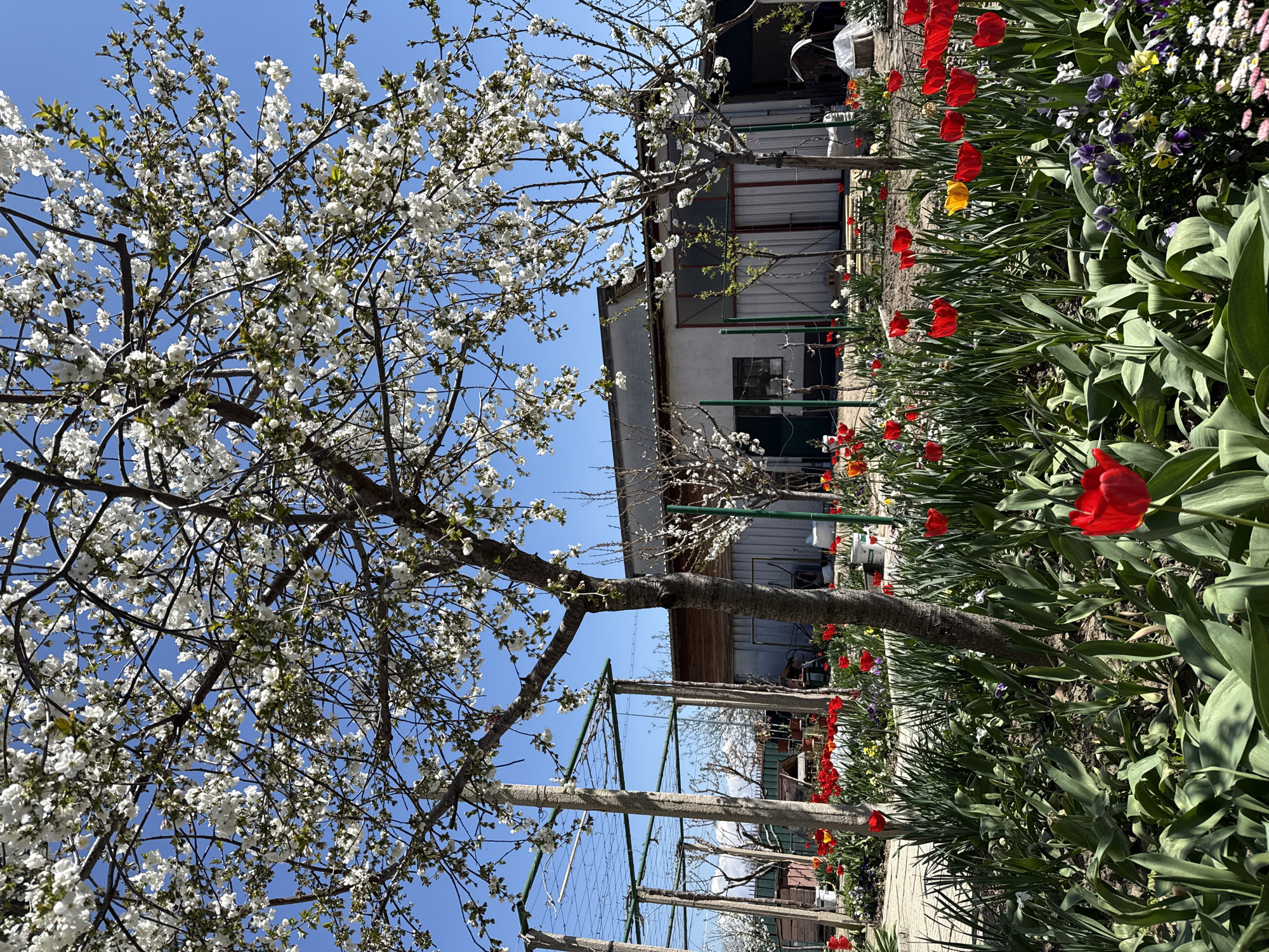 A garden scene in Trud, Bulgaria, features a blooming tree with white flowers against a clear blue sky