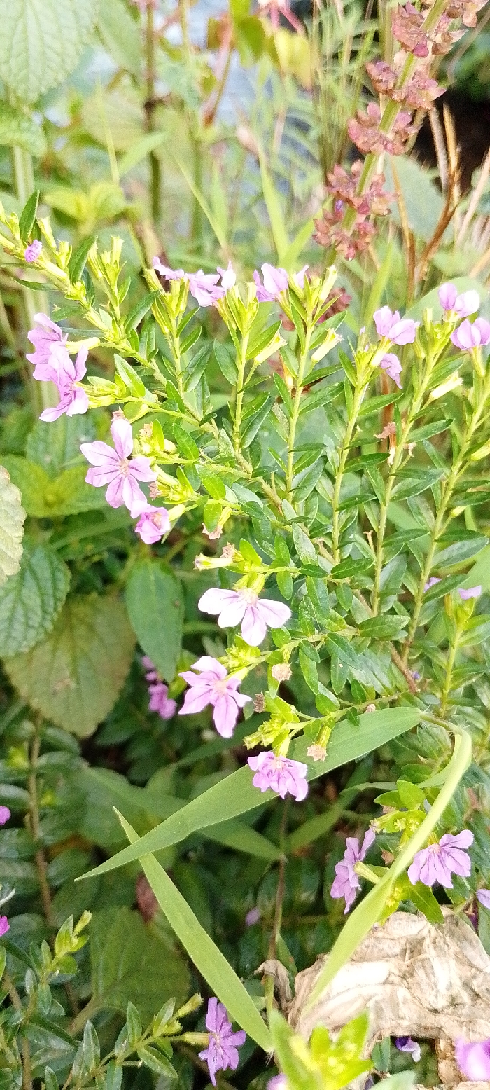 The image presents a vertical, close-up view of lush vegetation located in the city of Bogor, Indonesia. The primary subject is a flowering plant, identifiable by its multiple slender green stems densely covered with small, ovate, dark green leaves. Numerous small, pale purplish-pink flowers with five distinct petals are scattered along the upper portions of these stems, emerging from green calyces. The immediate foreground features a prominent, long, slender green leaf intersecting the lower-center of the frame. The background consists of a soft-focus arrangement of various green foliage, including broader leaves, and instances of reddish-brown dried plant material. The scene is illuminated by natural, diffused light, and no human figures, animals, or artificial structures are present.