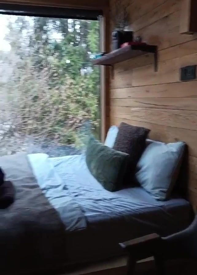 modern cabin interior, primarily focusing on sleeping areas. The walls are covered with light-colored wood planks. There are two beds, one with gray linens and green and brown pillows, and the other, near a window, featuring brown robes and a white towel. In another section, a bed is adorned with a teddy bear and a plaid blanket. A black wood-burning stove stands against a wall decorated with gray stone. Large windows provide views of a snowy forest outside. There is a gray chair in the foreground and a shelf with objects on the wall.