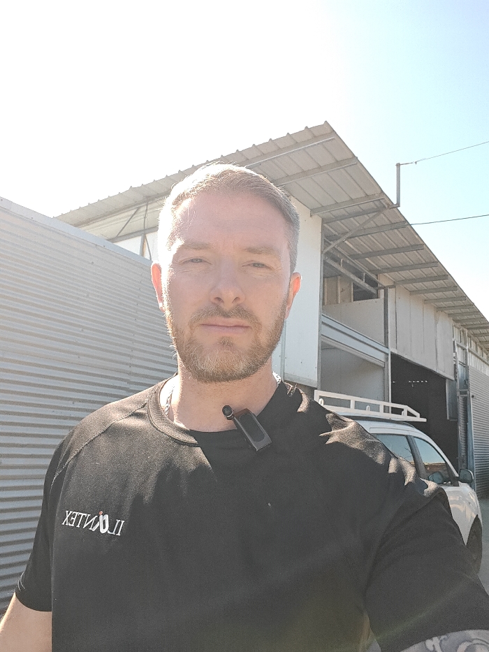 A male individual with light skin, short light-colored hair, and a trimmed beard faces the camera in an outdoor setting in Kiryat Ata, Israel. He wears a black t-shirt with the reversed text "ILLUMINATED" (or similar) on the chest and a dark-colored lapel microphone clipped to his right collar. A silver chain is visible around his neck, and a tattoo is partially visible on his left arm. The background features a corrugated metal wall on the left, and a light-colored industrial or warehouse-type building with a corrugated metal roof extending upwards to the right. A portion of a white vehicle, possibly an SUV or van with a roof rack, is visible behind the individual's right shoulder, parked near the building. The sky is clear blue and brightly illuminated by direct sunlight, casting strong highlights.