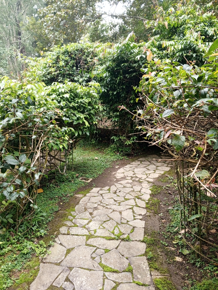 A winding stone path meanders through lush greenery. The path is constructed of irregularly shaped, light-colored stones, with patches of moss growing in between. Dense shrubs and bushes line both sides, creating a tunnel-like effect. Fences support the vegetation. The overall scene evokes a sense of tranquility and natural beauty.