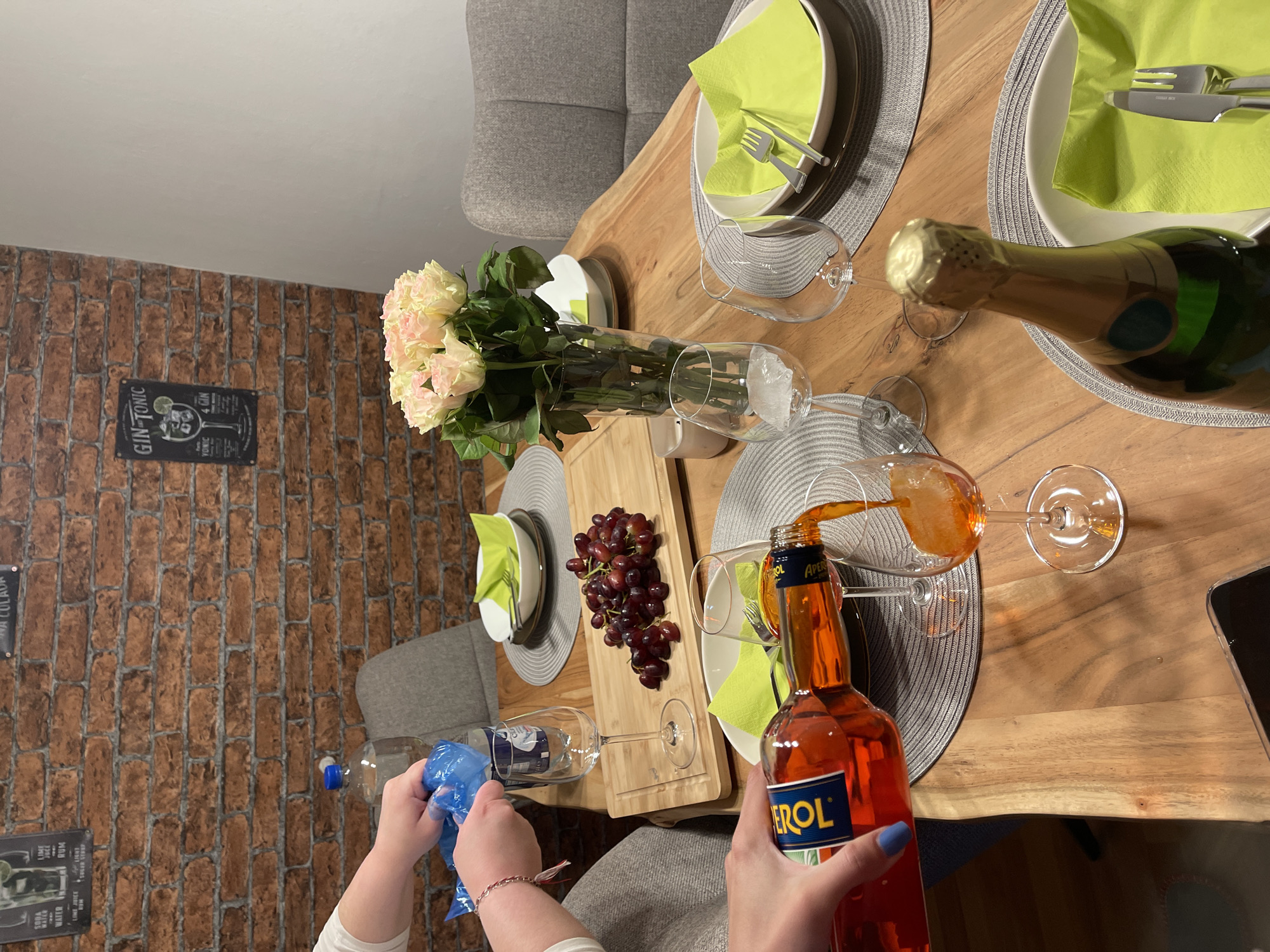 The scene depicts an indoor dining area within a residence in Saarbrücken, Germany. A wooden dining table is centrally positioned, set for a gathering. The background features a wall partially covered with red brick-patterned wallpaper or actual brick, displaying two framed metal signs; one clearly reads "GIN-TONIC" and shows a cocktail illustration. The right side of the background shows a plain, light-colored wall and grey upholstered dining chairs. On the table, at least three place settings are visible, each consisting of a round, grey, woven placemat, a white bowl, and a folded lime-green paper napkin. Some settings also include a knife and fork. A clear glass vase holds a bouquet of pale pink roses, and a small white candle is present. Two individuals' hands are actively involved in drink preparation. In the upper left quadrant, a pair of hands is shown extracting ice cubes from a blue plastic bag, positioned over an empty wine glass. In the lower center, a hand with blue nail polish is pouring an orange-red liquid from a bottle labeled "APERO L" into a clear wine glass that contains a large ice cube. Additional items on the table include a large clear plastic bottle with a blue cap, a bunch of dark red grapes arranged on a light wooden cutting board, and a dark green champagne bottle with a gold foil top. A black smartphone is partially visible on the table in the bottom left foreground.
