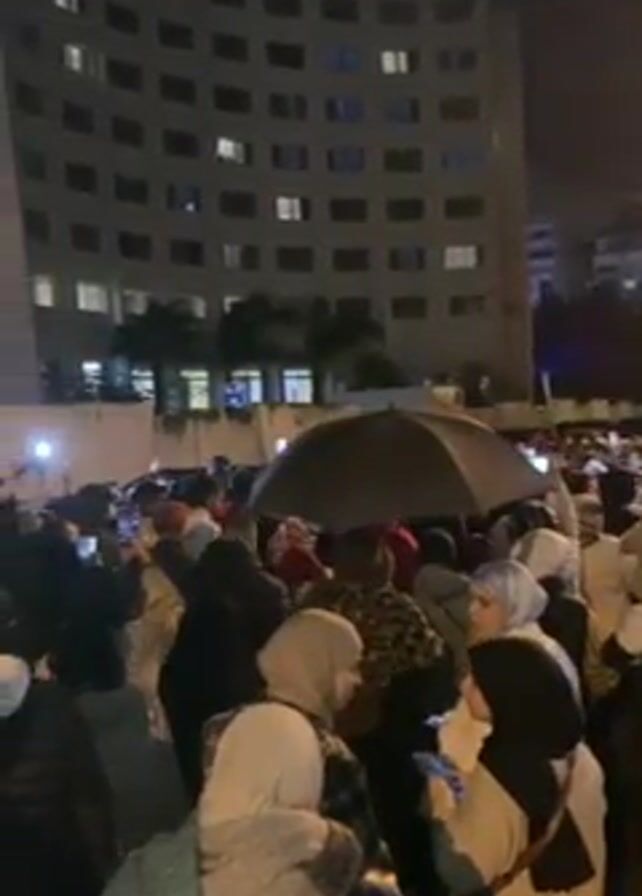 large crowd of people standing in an urban environment at night. The majority of the people in the crowd are wearing headscarves or hooded clothing. An umbrella is being held up in the middle of the crowd. Many people are holding up phones, seemingly taking pictures or videos. In the background is a tall, curved building with multiple windows. The scene seems to be a public gathering or protest. There are streetlights visible, and the overall lighting is muted. The atmosphere appears to be active, with movement and sound present.