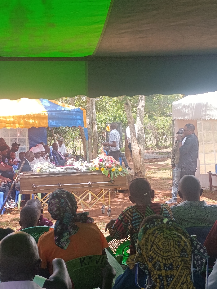 An outdoor funeral service is underway in Muthetheni ward, Kenya, under various temporary shelters