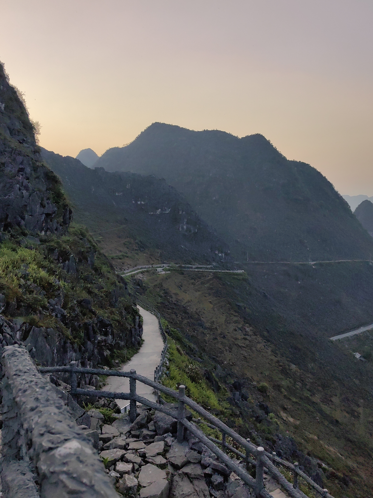 Captured at dusk, the image showcases a scenic mountain view in Đồng Văn Commune, Vietnam. The foreground features a winding pathway, bordered by a stone railing. The pathway snakes along a steep, rocky mountain slope, partially covered with vegetation. In the middle ground, a road winds through the mountain range. Several mountains are visible, their silhouettes fading into the dusky sky. The sky is a gradient of orange and pale blue, indicating either sunrise or sunset.