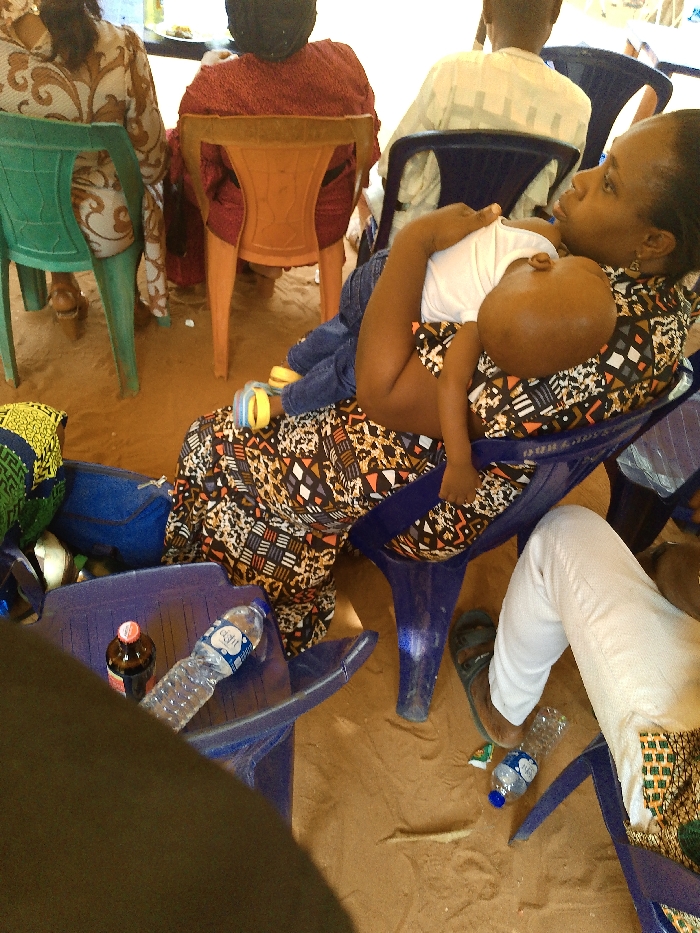 In Umuoji, Nigeria, a group of individuals is gathered, seated on various plastic chairs within an area featuring a reddish-brown dirt floor. In the foreground right, a dark-skinned woman in a patterned dress (black, white, orange, brown geometric design) is seated on a blue plastic chair, holding a baby. The baby, dressed in a white t-shirt and blue jeans with colorful sandals, rests against her chest, head facing away from the camera. To the immediate left of the woman, a blue bag and a patterned bag (yellow, blue, green) rest on the floor. On a small blue plastic surface in the lower left, a clear plastic bottle of "AQUA DANA" water and a small dark brown glass bottle with a red cap are visible. In the background, several individuals are seated: one person in a light-colored patterned dress on a green plastic chair (back to camera), another in a red garment on an orange plastic chair (back to camera), and a third in a light-colored traditional garment on a blue plastic chair (back to camera). Partially visible on the far right are the legs of a person wearing white trousers and dark sandals, also seated on a blue plastic chair. An empty "AQUA DANA" water bottle lies on the dirt floor near their feet.
