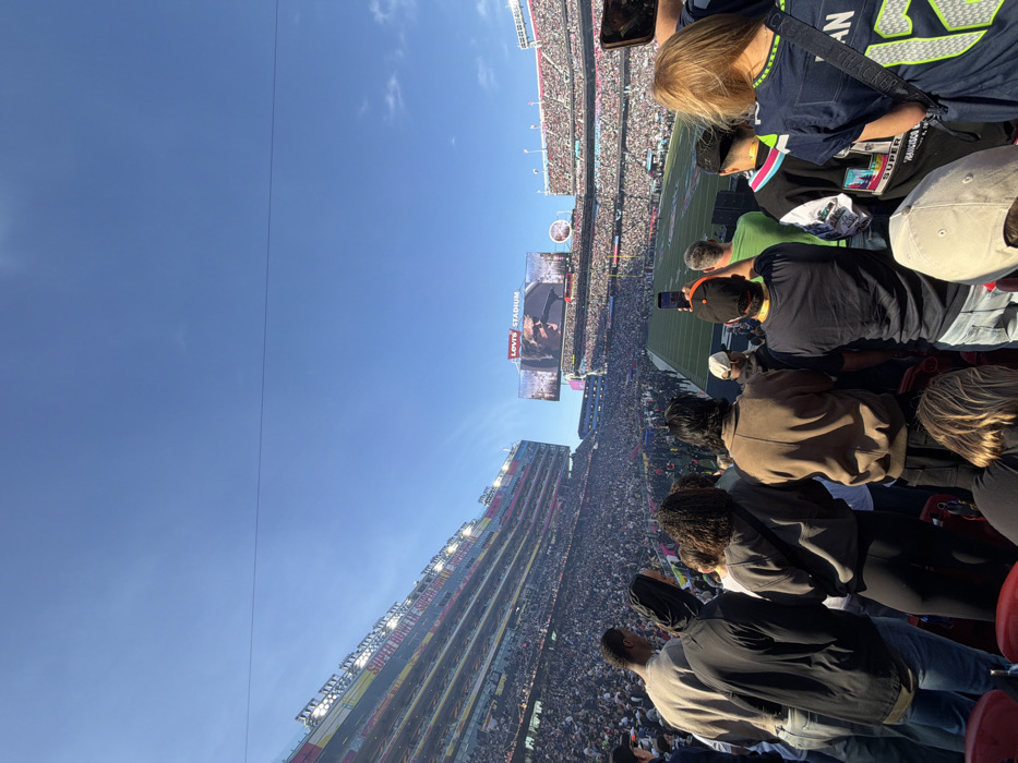 A stadium packed with people, possibly for a Super Bowl event, features a large screen displaying an image of a person. A green football field stretches out below the screen. A clear blue sky is visible. Spectators fill the stands, with some taking pictures. The image is slightly tilted. Levi's Stadium logo visible on the large screen.