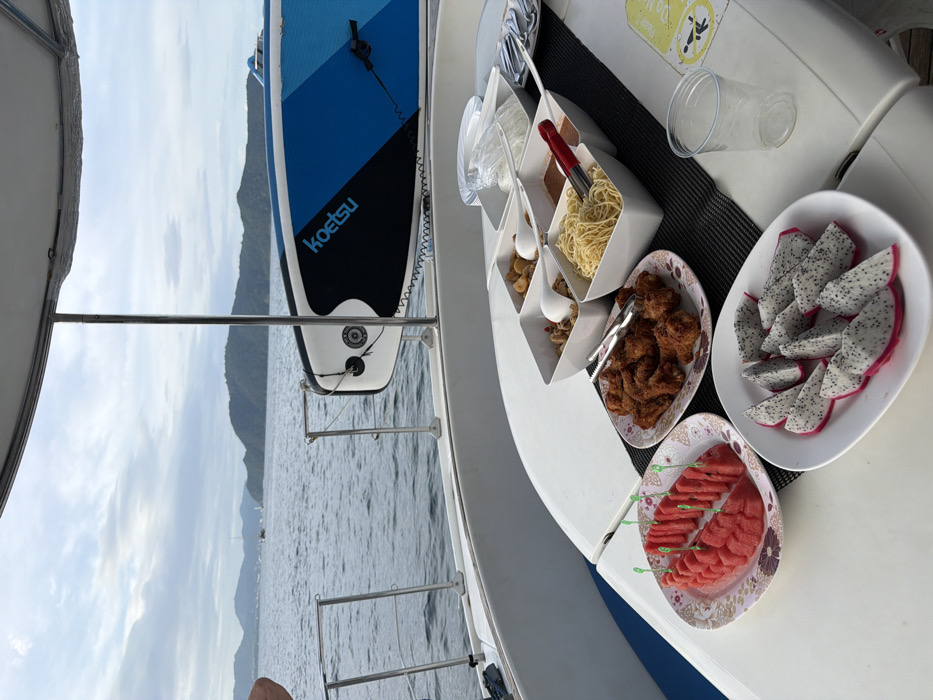The scene depicts a meal served on the deck of a white boat, situated in the coastal waters near Rawai, Thailand