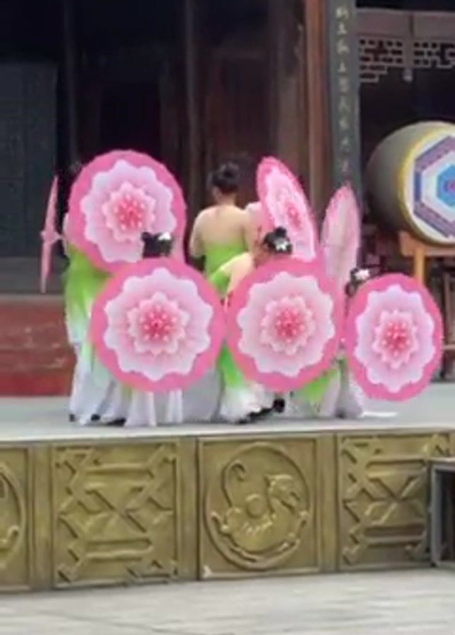 group of dancers performing on an outdoor stage. The dancers are wearing costumes that consist of white pants, pale green tops, and pink flower-shaped props that they hold in front of them. The stage is decorated with a repeating patterned design. There is a building behind the stage that has Chinese-style architecture. A large drum is visible on the right of the stage. A woman sings in the background.