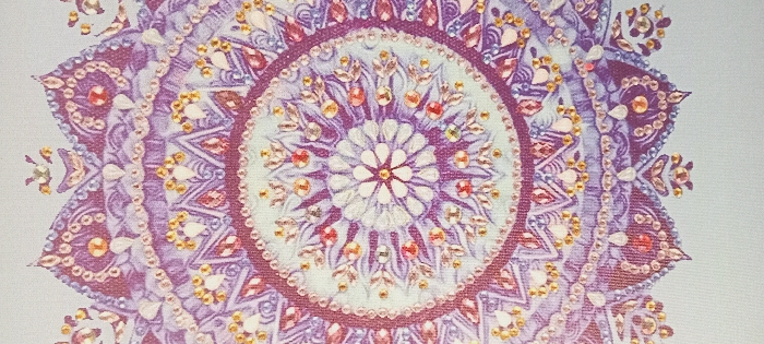 The image displays a detailed close-up of a vibrant, symmetrical circular design, identified as a decorative art piece, possibly a 'diamond painting' or embellished textile