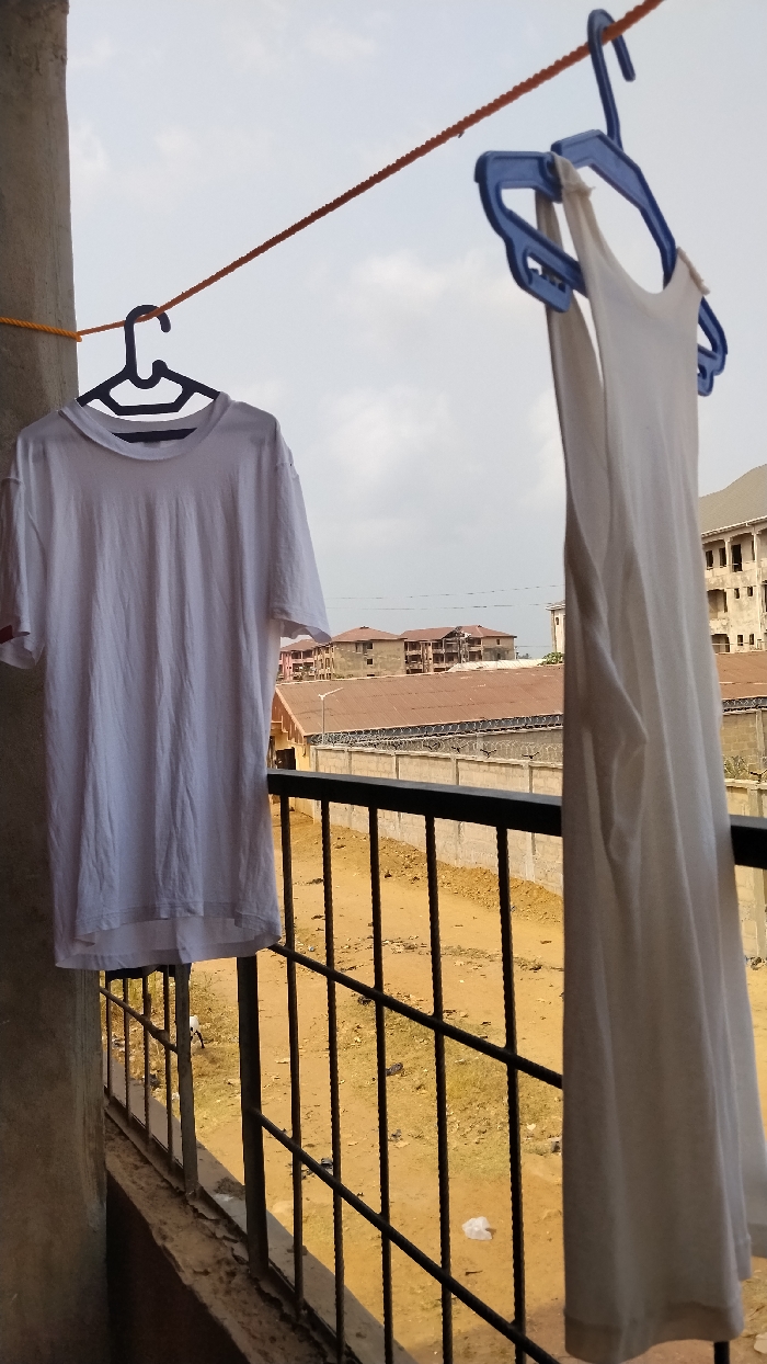 The scene depicts a view from a balcony in Isieke, Nigeria. An orange rope, serving as a clothesline, stretches diagonally across the upper portion of the frame. A white short-sleeved t-shirt hangs on a black plastic hanger from the left side of the rope. To its right, a white sleeveless tank top is suspended from the rope on a blue plastic hanger with a double-loop design. A light-colored concrete pillar is partially visible on the far left. Below these items, a black metal balcony railing extends horizontally across the lower section of the image. Beyond the railing, the ground consists of exposed reddish-brown dirt with scattered litter, including a crumpled white plastic item. A concrete wall topped with coiled barbed wire is visible horizontally in the midground, behind which are structures with corrugated metal roofs and a streetlamp. In the background, multiple multi-story buildings, some in various stages of construction, are discernible against a partially cloudy sky.