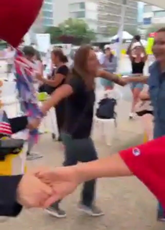 A group of people participate in a circle dance, holding hands and circling around a person wearing a Donald Trump mask and holding a red heart-shaped balloon. The dancers, predominantly women, are dressed in casual clothing, including jeans, t-shirts, and a denim jumpsuit. The Trump impersonator wears a black suit with a yellow wig attached to the mask. The background features a city skyline with modern buildings and a tent structure overhead. Some attendees are seen taking photos or watching.