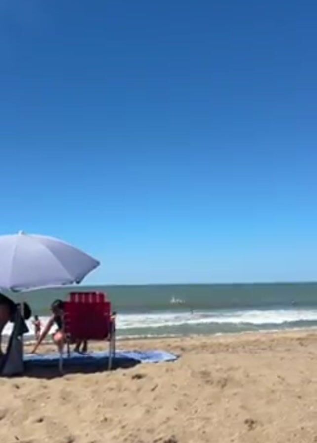 The scene is a bright, sunny day at the beach
