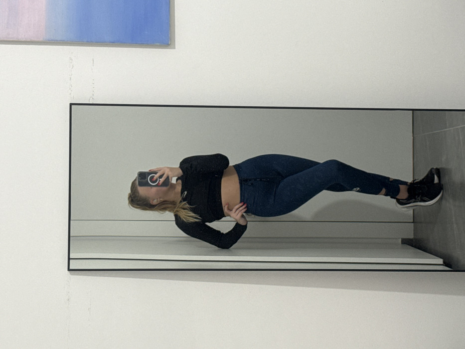 A reflection in a large, framed mirror displays a woman taking a photo of herself. She is wearing a black long-sleeve crop top and dark leggings with black sneakers. The wall behind the mirror is white with a painting partially visible in the upper left corner. To the right of the mirror is a grey tiled wall. The woman has blonde hair pulled back. The phone she is using to take the photo has a white circular accessory.