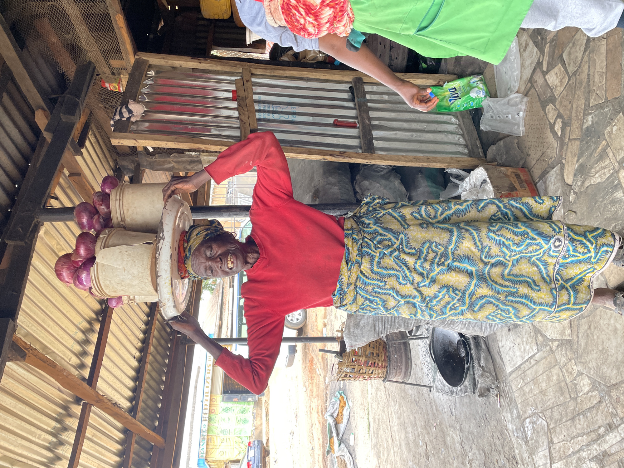 - "An elderly woman stands centered in the image, balancing two white plastic buckets filled with red onions on a white tray atop her head" by FM-yoif63, licensed under CC BY 4.0