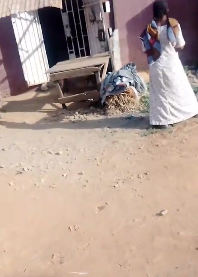A person in a white dress is standing near a building with a small porch area. The person is carrying something colorful on their back. The ground is dirt and there are some rocks and debris scattered around. The camera pans over to a pile of dirt and rocks next to a wall.