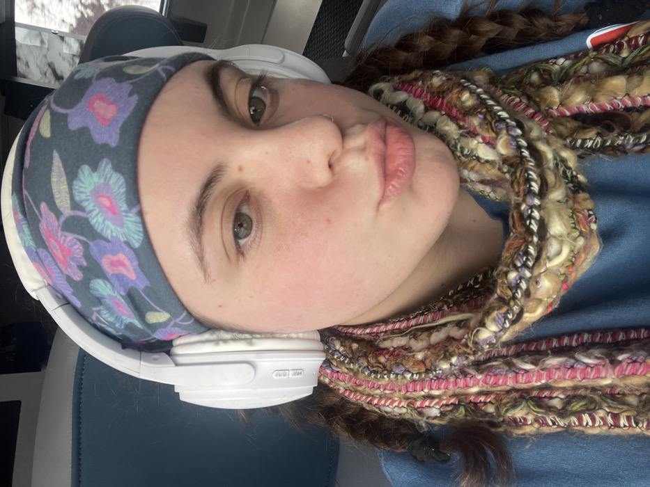 An individual is depicted in a close-up, self-portrait photograph. The subject, a young adult with fair skin, brown hair styled in two braids, and hazel eyes, looks directly forward with pursed lips. A small nose ring is present in the left nostril. They wear a dark teal head wrap patterned with pink, purple, light blue, and yellow flowers, positioned under white over-ear headphones. The visible earcup of the headphones displays "M/F" and "ON/OFF" labels. A multi-textured, multi-colored scarf, featuring shades of pink, brown, yellow, green, and purple, is wrapped around the subject's neck, worn over a blue long-sleeved garment. The background indicates an indoor travel environment, likely within a vehicle such as a train or bus, with a teal upholstered seat visible on the left and a blurred window view on the right suggesting a bright, possibly snow-covered, outdoor scene. No specific identifiable landmarks or signs within the image definitively confirm the location as Darien, United States of America; the context is limited to an indoor travel setting.