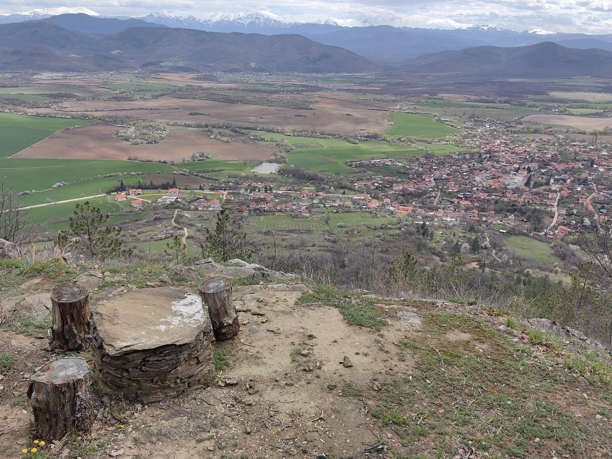 A high-angle landscape view depicts a scenic overlook with a rugged stone seating area composed of a stone table and tree-trunk stools on the edge of a hill, facing a panorama of fields, mountains, and a town. The town, identified as Vrabevo, Bulgaria, is visible in the mid-ground, displaying densely-packed red-roofed buildings amongst patches of green vegetation. Beyond Vrabevo, the landscape opens into an expansive area of farmland with a mixture of green and brown fields. Further back, the rolling mountains form a backdrop. Snow-capped peaks are visible on the horizon under a cloudy sky. The overlook itself features dry ground with sparse grass and vegetation around the stone seating arrangement. Yellow dandelions are scattered in the foreground.