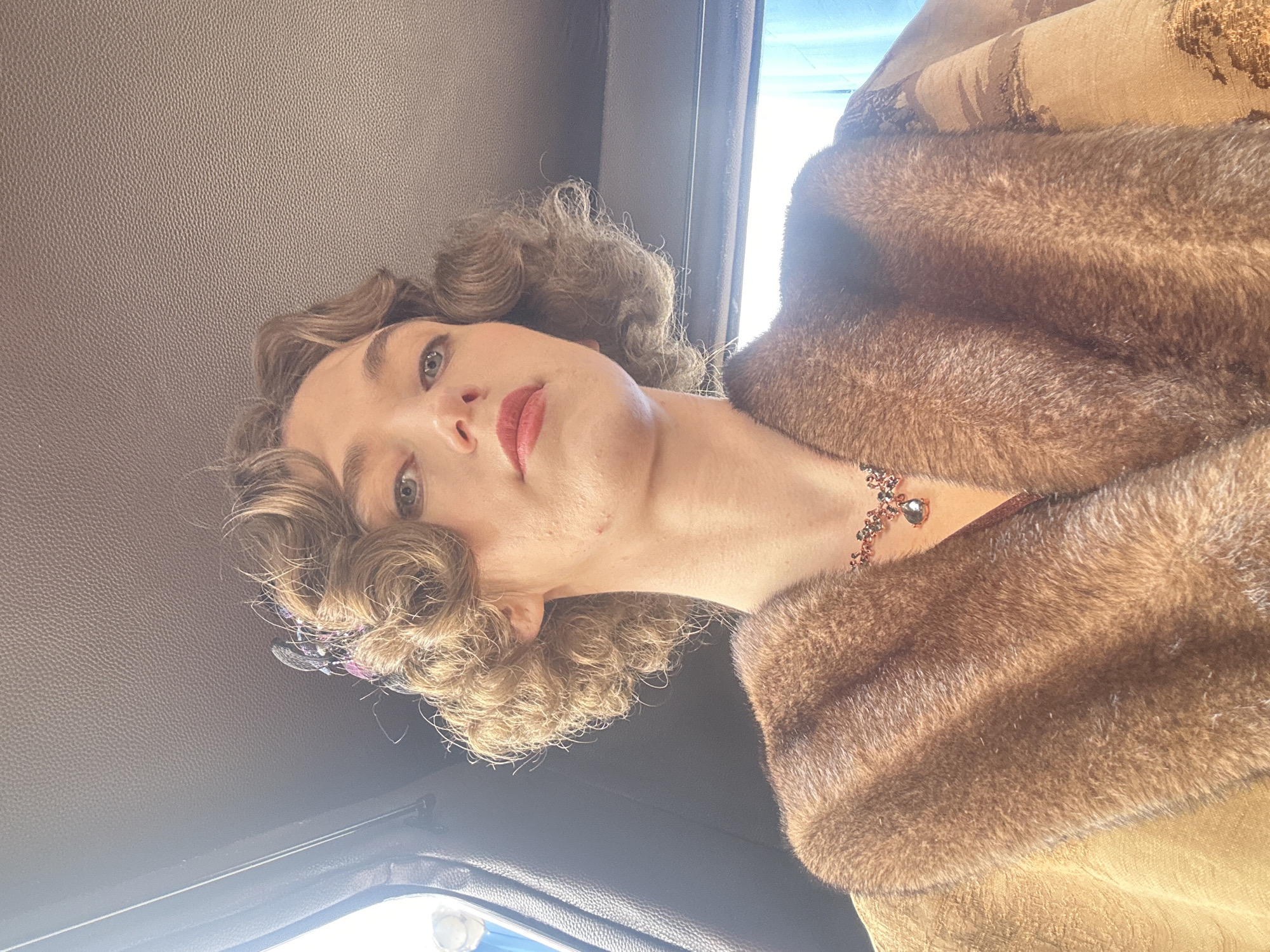A female subject, appearing to be an adult, is depicted from the chest up in a vehicle interior within Huangdao District, China. She has light-colored eyes and light brown, tightly curled hair styled in a period fashion, with a small dark accessory visible on the left side of her head. Her lips are colored with red lipstick. She wears a brown fur collar or wrap over a light brown or gold garment with a subtle pattern. A necklace with a dark beaded chain and a teardrop-shaped pendant is around her neck. The subject looks directly at the camera. The vehicle's ceiling is a textured grey-brown, and a partial view of a window on the left side shows bright ambient light. A dark seat or headrest is visible to the left of the subject.