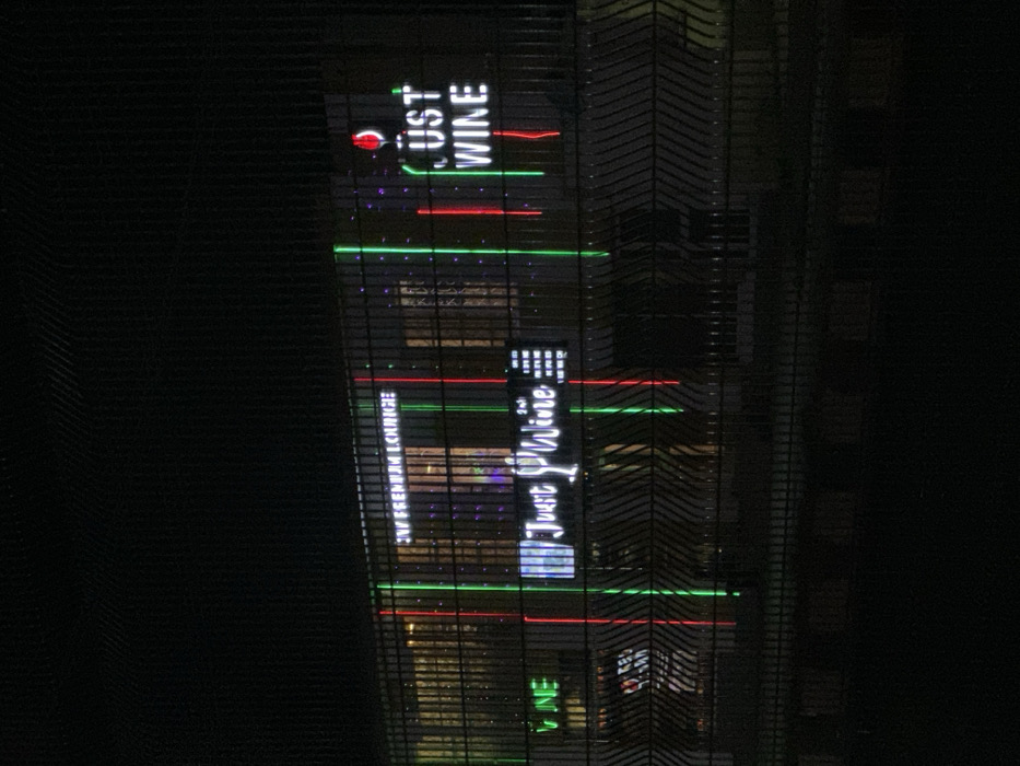 The image displays a commercial building at night in Barden Yana, Nigeria, observed through a dark, grid-patterned metal fence in the foreground. The building's facade is illuminated by vertical red and green LED strip lights. Multiple white neon signs are visible: "JAV PREMIUM LOUNGE" on the upper section, "Just Wine" with a stylized wine glass graphic centrally, and a prominent "JUST WINE" sign featuring a red wine glass graphic on the right side. A smaller, rectangular sign with illegible text is positioned below the central "Just Wine" sign. Interior lighting and decorative twinkling lights are discernible through the building's windows. No individuals or activities are visible.