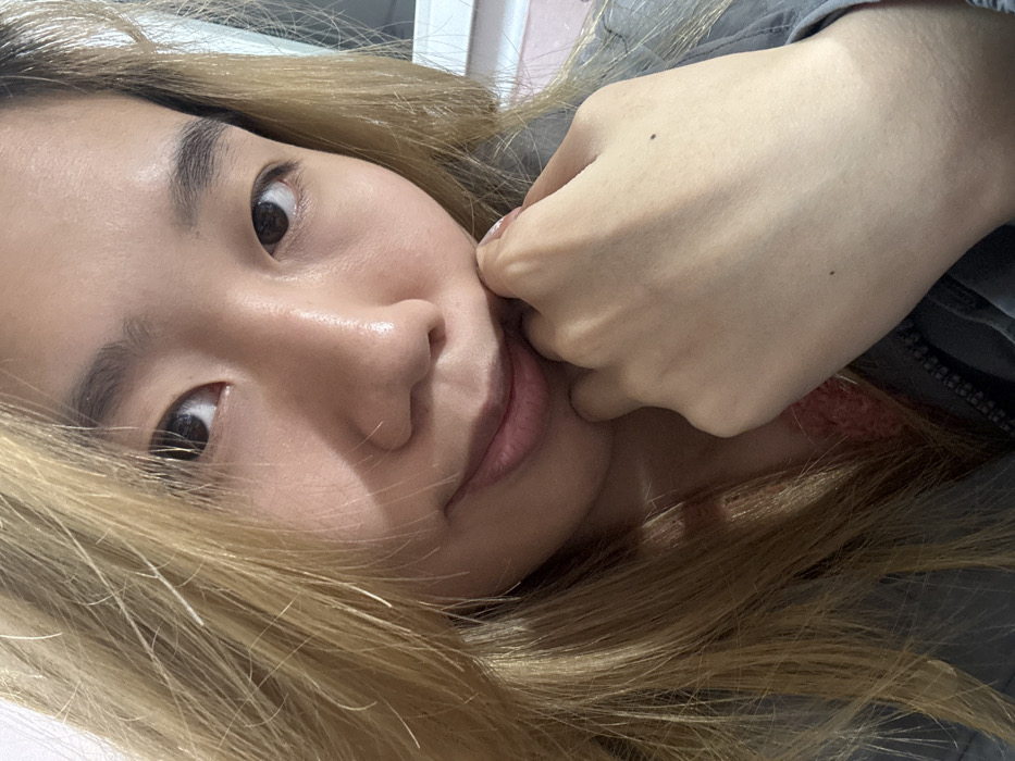 A close-up portrait shot features an East Asian female, located in an indoor setting within the city of Shapingba District, China. The subject has long, light brown hair framing the left side of her face. She has dark brown eyes, natural eyebrows, and a fair complexion with a visible sheen on her forehead and nose. Her lips are slightly parted, indicating a subtle smile. Her right hand is positioned with fingers gently curled, resting against the lower left side of her face, near the chin. Two small, dark moles are visible on the dorsal surface of her right hand. She is wearing a dark gray or similar colored zippered jacket, with a lighter-colored, possibly pink or peach, garment visible beneath. The background is indistinct and light-colored, suggesting an interior space, with a vertical white element visible on the right side of the frame. Lighting appears to be artificial, creating soft shadows on the left side of her face and under her chin.