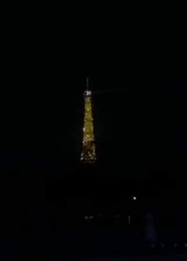 nighttime view of the Eiffel Tower in Paris, illuminated with twinkling lights. The tower stands tall and bright against the dark sky. The camera appears to be stationary, providing a steady view of the iconic landmark. In the foreground, only vague outlines of trees and possible structures can be distinguished, adding to the depth of field and emphasizing the tower as the focal point. The video is simple and straightforward, capturing the beauty of the Eiffel Tower at night.