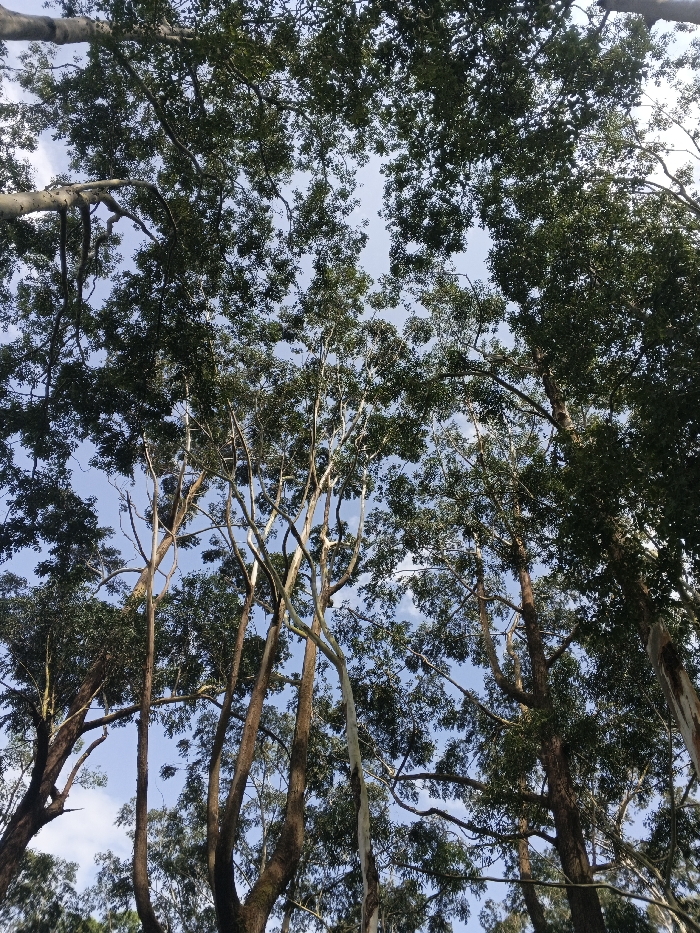 - "A low-angle view reveals a dense canopy of eucalyptus trees, their slender, mostly bare trunks stretching upwards" by FM-eCUqk2, licensed under CC BY 4.0