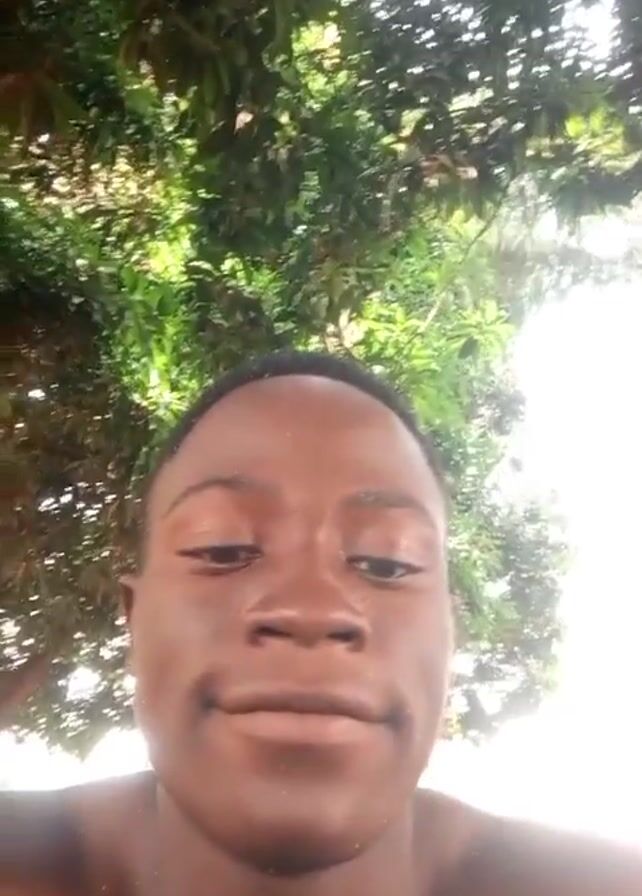 A video focuses on the face of a young Black man looking directly into the camera with a neutral expression. He is shirtless. The background shows a vibrant green tree with dense leaves, partially obscuring a bright sky, suggesting an outdoor setting.