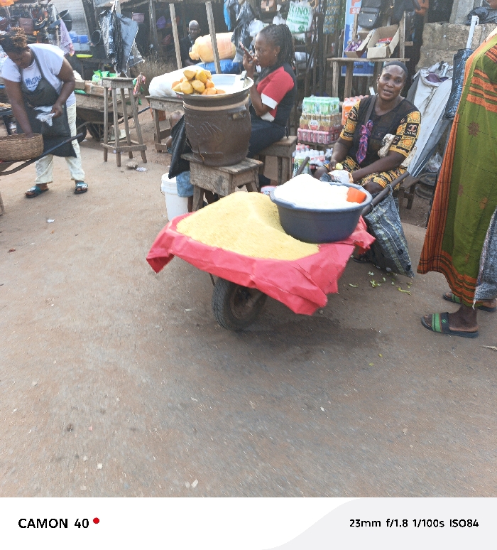 A vibrant street scene displays vendors selling food items. A woman sits on a stool with a pot of what appear to be fried snacks, engaging on her cell phone. Adjacent to her, a woman sits in a cart filled with grains covered by a red cloth, smiling towards the camera. Another vendor is nearby preparing food with a basket. The image is captured on a sunny day.