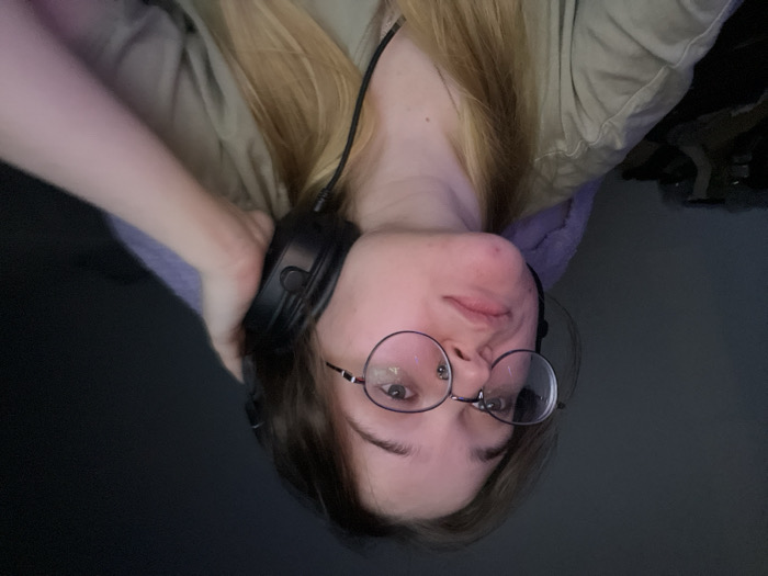 The image depicts a young adult female in a dimly lit indoor setting, specifically located in Pushchino, Russia. She is shown from the chest up, positioned slightly angled to her right, looking directly at the camera with a neutral expression. She has long, light brown hair and wears round, metal-frame glasses. Her right hand is actively holding the right earcup of black over-ear headphones, which are worn on her left ear. A black cable extends from the left earcup. She is wearing a light-colored, possibly beige, crew-neck t-shirt. The background is dark and out of focus, with indistinct shapes including a section of purple fabric visible behind her left shoulder.
