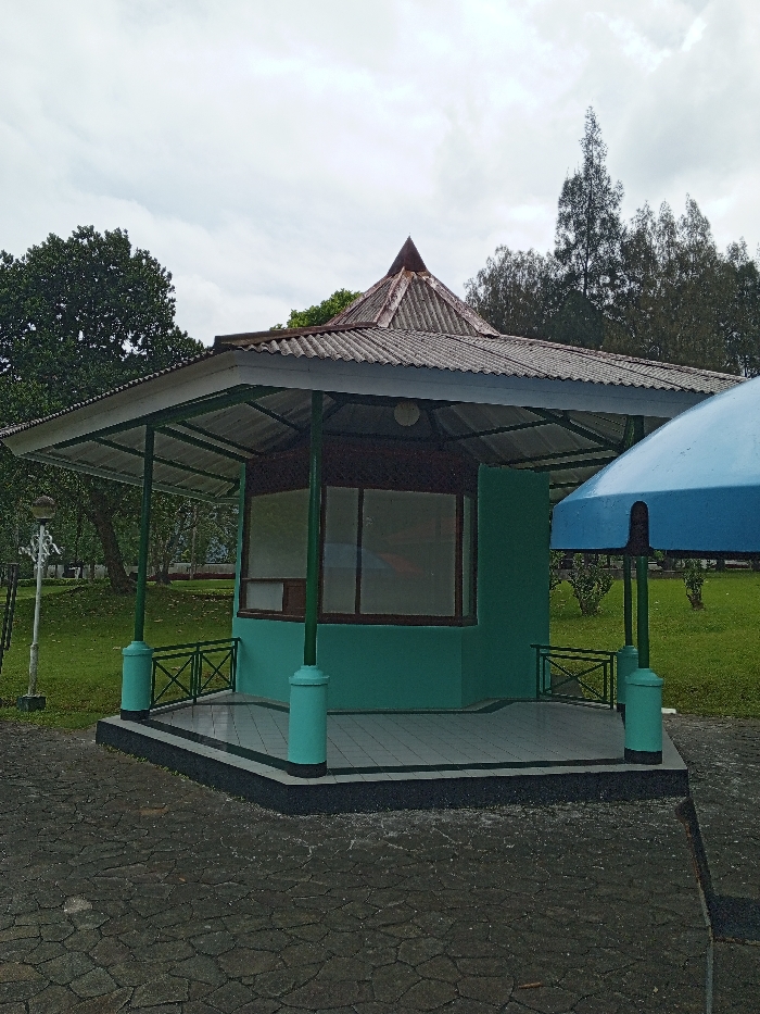 A green, square pavilion stands on a tiled base with a black border. It has a complex, multi-tiered roof. The structure features pillars with cylindrical bases and a small fence. Trees and grass surround the pavilion, and the sky is overcast. Part of a blue structure is visible on the right side. The foreground is paved with dark stones.