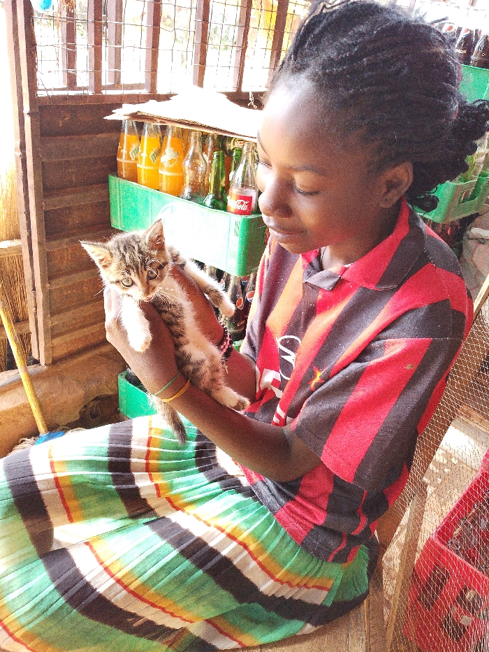This image depicts a young adult female holding a kitten at a commercial establishment in Sabon Tasha, Nigeria