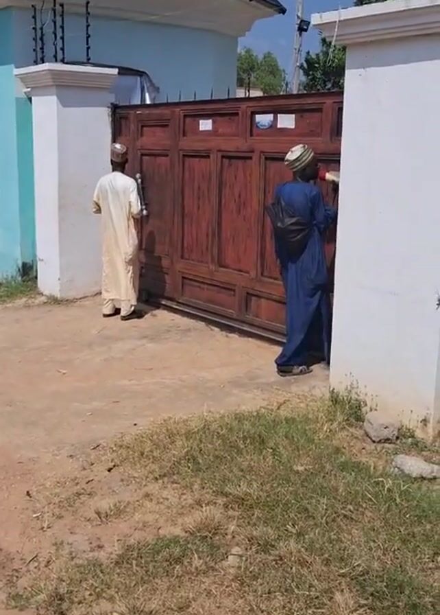 Two men wearing long robes and hats stand outside a brown gate. One man wears a blue robe and a black backpack, and he speaks into a white megaphone. The other man wears a white robe and holds papers in his hand. The gate is set between two white pillars, which are part of a wall that surrounds a blue-colored building with a black tiled roof. The ground is a mix of dirt and grass.