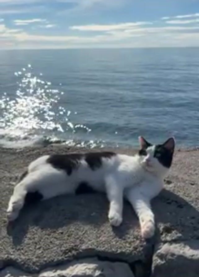 black and white cat lying on a stone wall by the sea on a sunny day. The cat is mostly white with black patches, and it is lying on its side facing the sea. The sea is blue and there are some white clouds in the sky. The sun is reflecting off the water, creating a sparkling effect. The cat stretches, rolling onto its back and licking its belly before returning to its original position.