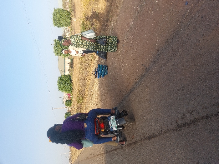 Two women stand beside a road with a shopping bag near them. One wears a green patterned dress and head wrap, while the other wears a white head covering. A woman in a purple top and blue jeans sits on a motorcycle facing away from the viewer. The motorcycle's license plate is partially visible. The backdrop features low vegetation and a blue sky.