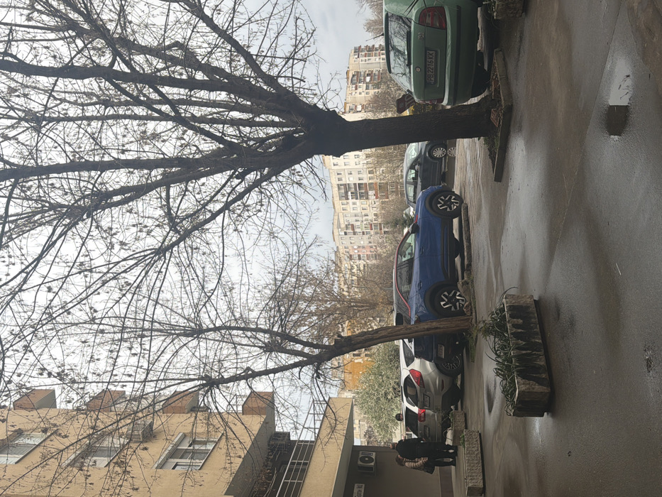 The scene depicts an outdoor urban environment at Boulevard 6th September, No. 10, Plovdiv, Bulgaria, under an overcast sky. The ground surface is paved and wet, exhibiting reflections and small puddles, indicating recent precipitation. Multiple bare-branched deciduous trees, indicative of late autumn or winter, are prominently featured, including two in the foreground with exposed root areas at their base. On the left, a multi-story residential building with a light beige facade, balconies with metal railings, and white-framed windows is visible. A white sign reading "бул. "6-ти Септември" No 10" is affixed to this building. Several air conditioning units are mounted on its exterior. In the mid-ground, a parking area contains several vehicles. A green Skoda hatchback with Bulgarian license plate PB 2216 KK is parked facing away from the viewer on the right side. To its left, a blue Nissan Juke SUV is partially obscured by a tree, parked facing left. Further left, a silver Ford Fiesta hatchback is parked, and another light-colored vehicle is partially visible behind it. In the background, numerous multi-story apartment buildings with varied facades are observed. Three individuals are standing near the silver Ford Fiesta on the left side of the scene. One person in a dark jacket is seen from the back, while two others, one in a dark jacket and another in a light coat, are conversing. In the foreground, two rectangular concrete planters containing sparse green plants are positioned on the wet pavement.