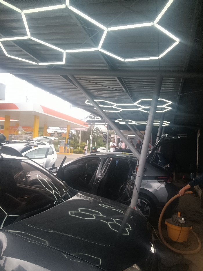 A car wash bay features two cars being cleaned, one black and one gray. The black car is in the foreground. The gray car has its trunk open. A yellow bucket and vacuum hose are visible near the gray car. Overhead, fluorescent lighting in a hexagonal pattern illuminates the area. A gas station is visible in the background.