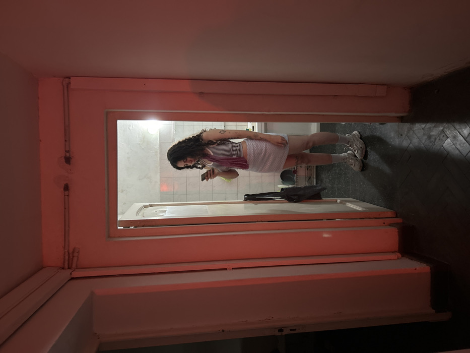 A person with curly dark hair stands in the doorway of a bathroom. The person is looking down at their phone while wearing a striped crop top, a patterned mini skirt, white socks, and white sneakers. A pink scarf hangs around their neck. The bathroom is visible behind them and an open black tote bag lays on the floor in front of the doorway. The lighting in the hallway is red.